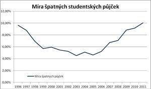 Jenže není všechno zlato, co se třpytívá. Pohled na graf dává tušit, v čem je problém – v nesplacených půjčkách. Zatímco míra špatných půjček u firemních úvěrů je v současnosti jedno procento a u rizikově vnímaných kreditních karet 2,5 procenta, u studentských půjček dosahuje desíti procent a má rychle rostoucí trend. To zhruba odpovídá vrcholu problémů hypoték z konce roku 2009. Situaci, která byla vnímána jako katastrofální. Ale co víc, i v dobrých letech se podíl nesplácených půjček pohyboval okolo pěti procent.