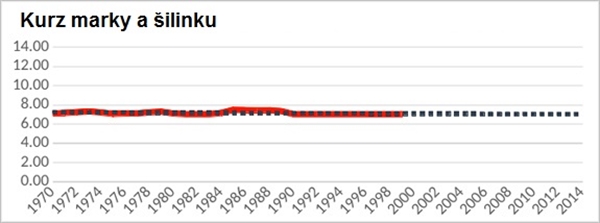 Tečkovaná čára je předpokládaný trend. Totéž platí i pro holandský gulden nebo lucemburský frank. Takové země, mezi kterými zůstává směnný kurz dlouhodobě víceméně stejný, můžou spolu klidně jít do měnové unie.