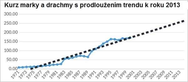 Řecko vstoupilo do eurozóny dne 1. ledna 2001 s kurzem 174,2227 drachmy za německou marku a tehdy, začátkem roku 2001 byl tento kurz bezpochyby reálný. Ale co dál? O pět let později? O deset? Do grafu stačí přidat jednoduchou čáru jako vyjádření trendu – a výsledek je jasný: