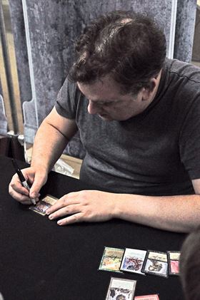 Na snímku (ke zvětšení kliknutím) podepisuje na turnaji v Miláně Mark Tedin, jeden z pětadvacítky původních ilustrátorů Magiců, „své“ kartičky. Jejich sběratelská hontoa tím pochopitelně narůstá.