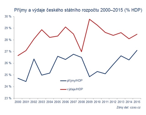 Zpět k české realitě. Odvážně prognózujme, že letošní saldo státního rozpočtu opravdu skončí vyrovnaně. Máme podpořit spotřebu otevřením šampaňského? Podíl příjmů a výdajů státního rozpočtu na HDP trvale roste. V roce 2008 činily příjmy státního rozpočtu 26,5 procenta HDP, výdaje 27 procent. V roce 2012 to bylo na straně příjmů 25,9 procenta, na straně výdajů 28,4 procenta. V roce 2015, kdy se již naplno projevuje politika současné vlády, jde u příjmů o 27,1 procenta, u výdajů 28,5 procenta. A tento trend chce vláda zjevně udržovat.