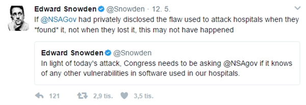 Zadruhé, tento konkrétní útok má poměrně jasného původce. Je jím americká rozvědná agentura NSA – National security agency. Byl to právě americký úřad pro bezpečnost (sic!), kdo vyvinul postup, na kterém byl útok založen (využívá bezpečnostní díry ve Windows), a kdo si ho pak nechal ukrást hackery. Trefně případ komentoval Edward Snowden: bezpečnostní úřad by měl o objevených bezpečnostních dírách diskrétně informovat, nikoli je utajovat v naději, že je později sám využije.