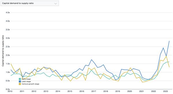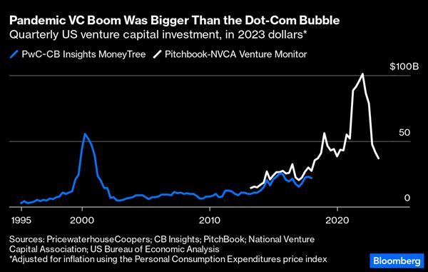 Valuace a objem investic do startupů se tak po extrémních hodnotách let 2020 a 2021 vrátily na zem, do období před covidem. Například objem VC investic v prvním kvartálu 2021 činil 155 miliard dolarů (3,3 bilionu Kč), během následujících dvou let ale klesl na 76 miliard dolarů (1,64 bilionu Kč), tedy na hodnotu na úrovni roku 2019. A to i přes nedávné masivní investice do firem jako OpenAI.